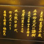 寺院としての宗教活動、財産ともに充実しましたので、平成29年8月所轄庁より宗教法人規則の認証を受けることもできました。身延山志摩房に鎮座されていた御像は平井妙光法尼によって色彩が施され、法尼遷化後御尊像は身延山志摩房へ戻り、今現在は一妙寺へ在られます。身延山では全国からの信徒さまの願いを背負われたことでしょう、先師のお志を色褪せることなく発信するためには勤行しかありません。一妙寺は今日も信徒の皆さまと祈りたいと思います。
